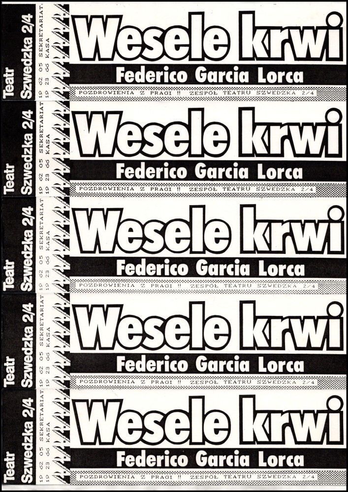 Projekt biletów na spektakl "Wesele krwi" Object Projekt biletów na spektakl "Wesele krwi" Udostępnij Ilość stron: 2 Data: 6 October 1990 Język: polski Właściciel dokumentacji: TR Warszawa Licencja: CC 2.0 Warunki udostępniania: Spektakle 0001 Wesele krwi Wesele krwi director: Krzysztof Kelm : Federico García Lorca 1990 Play