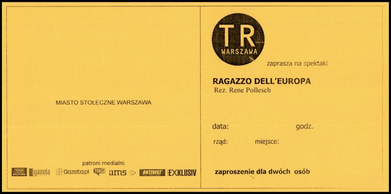 Zaproszenie na spektakl "Ragazzo dell'Europa" Object Zaproszenie na spektakl "Ragazzo dell'Europa" Udostępnij Ilość stron: 1 Język: polski Właściciel dokumentacji: TR Warszawa Licencja: CC 2.0 Warunki udostępniania: Spektakle 0001 Ragazzo dell'Europa Ragazzo dell'Europa : René Pollesch : René Pollesch 2007–2024 Play