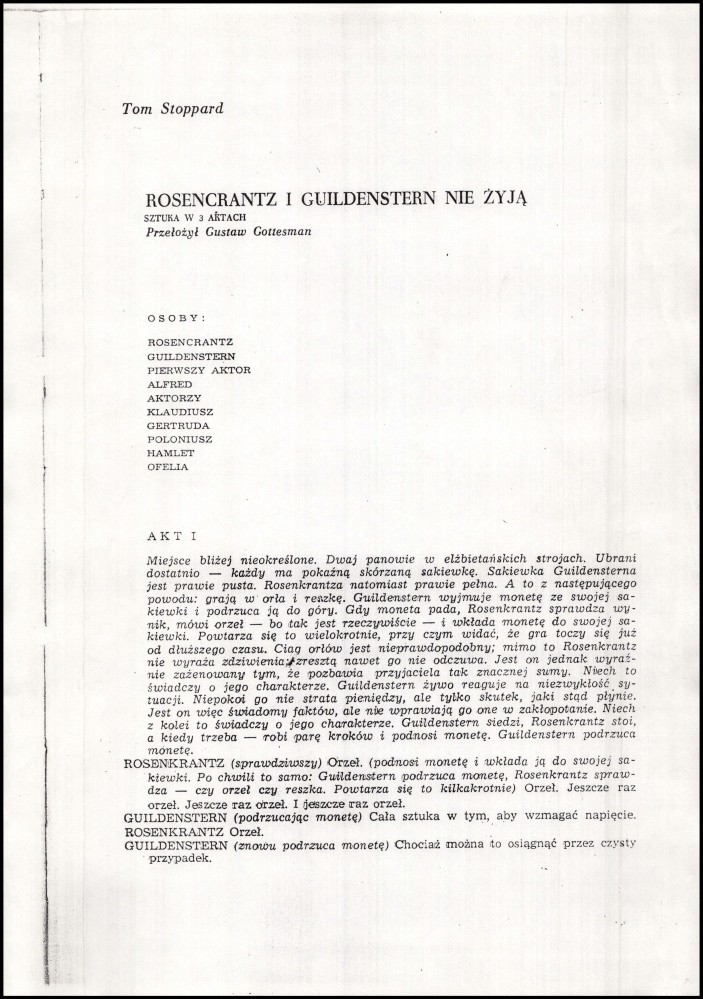 Egzemplarz reżyserski do spektaklu "Rosencrantz i Guildenstern nie żyją" Obiekt Egzemplarz reżyserski do spektaklu "Rosencrantz i Guildenstern nie żyją" Udostępnij Kategoria: egzemplarze reżyserskie reżyser: Jacek Pazdro Ilość stron: 44 Data: 5 lutego 1994 Język: polski Właściciel dokumentacji: TR Warszawa Licencja: CC 2.0 Warunki udostępniania: Warunki typowe Osoby 0001 Jacek Pazdro Jacek Pazdro reżyser, kierownik produkcji, scenografia, statysta Osoba