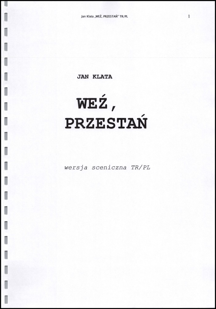 Egzemplarz reżyserski sceniczny do spektaklu "Weź, przestań" Obiekt Egzemplarz reżyserski sceniczny do spektaklu "Weź, przestań" Udostępnij Kategoria: egzemplarze reżyserskie Ilość stron: 26 Data: 21 kwietnia 2006 Język: polski Właściciel dokumentacji: TR Warszawa Licencja: CC 2.0 Warunki udostępniania: Warunki typowe Spektakle 0001 Weź, przestań Weź, przestań 2006–2008 Spektakl