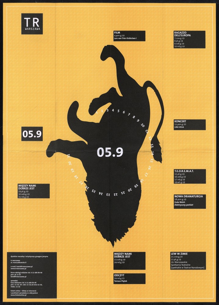 Repertuar Teatru Rozmaitości z sezonu 2008/09 - maj Obiekt Repertuar Teatru Rozmaitości z sezonu 2008/09 - maj Udostępnij Kategoria: repertuar grafik: Grzegorz Laszuk Ilość stron: 2 Data: 1 majaa 2009 Język: polski Właściciel dokumentacji: TR Warszawa Licencja: CC 2.0 Warunki udostępniania: Warunki typowe Osoby 0001 Grzegorz Laszuk Grzegorz Laszuk grafik Osoba