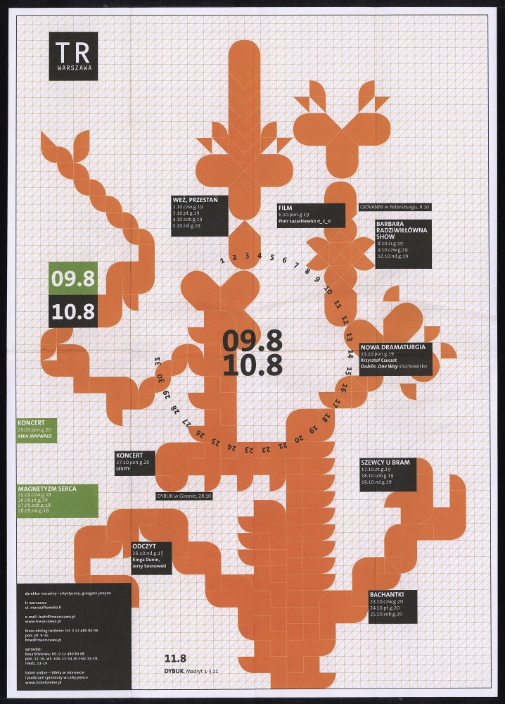 Repertuar Teatru Rozmaitości z sezonu 2008/09 - wrzesień/październik Obiekt Repertuar Teatru Rozmaitości z sezonu 2008/09 - wrzesień/październik Udostępnij Kategoria: repertuar grafik: Grzegorz Laszuk Ilość stron: 2 Data: 1 września 2008 Język: polski Właściciel dokumentacji: TR Warszawa Licencja: CC 2.0 Warunki udostępniania: Warunki typowe Osoby 0001 Grzegorz Laszuk Grzegorz Laszuk grafik Osoba