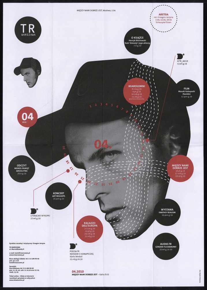 Repertuar Teatru Rozmaitości z sezonu 2009/10 - kwiecień Obiekt Repertuar Teatru Rozmaitości z sezonu 2009/10 - kwiecień Udostępnij Kategoria: repertuar grafik: Grzegorz Laszuk Ilość stron: 2 Data: 1 kwietnia 2010 Język: polski Właściciel dokumentacji: TR Warszawa Licencja: CC 2.0 Warunki udostępniania: Warunki typowe Osoby 0001 Grzegorz Laszuk Grzegorz Laszuk grafik Osoba
