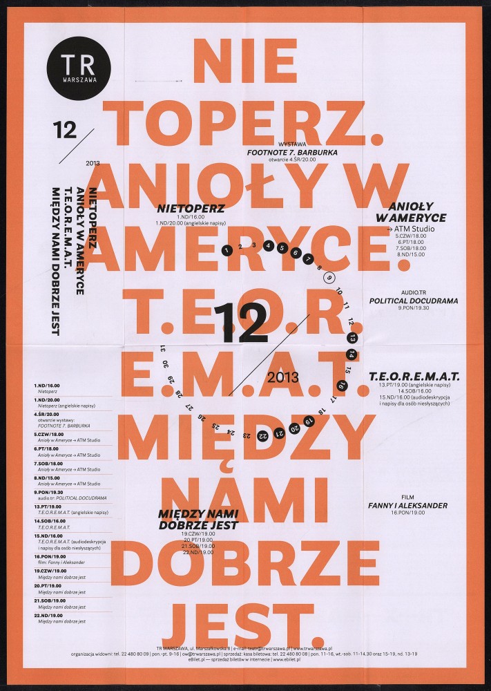 Repertuar Teatru Rozmaitości z sezonu 2013/14 - grudzień Obiekt Repertuar Teatru Rozmaitości z sezonu 2013/14 - grudzień Udostępnij Kategoria: repertuar grafik: Grzegorz Laszuk Ilość stron: 2 Data: 1 grudnia 2013 Język: polski Właściciel dokumentacji: TR Warszawa Licencja: CC 2.0 Warunki udostępniania: Warunki typowe Osoby 0001 Grzegorz Laszuk Grzegorz Laszuk grafik Osoba