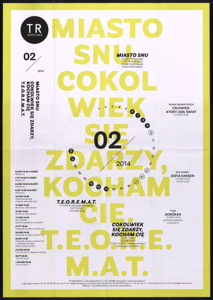Repertuar Teatru Rozmaitości z sezonu 2013/14 - luty Obiekt Repertuar Teatru Rozmaitości z sezonu 2013/14 - luty Udostępnij Kategoria: repertuar grafik: Grzegorz Laszuk Ilość stron: 2 Data: 1 lutego 2014 Język: polski Właściciel dokumentacji: TR Warszawa Licencja: CC 2.0 Warunki udostępniania: Warunki typowe Osoby 0001 Grzegorz Laszuk Grzegorz Laszuk grafik Osoba