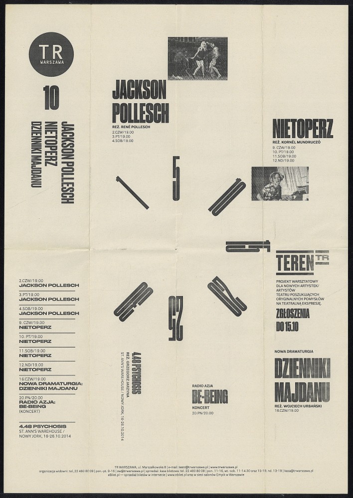 Repertuar Teatru Rozmaitości z sezonu 2014/15 - październik Obiekt Repertuar Teatru Rozmaitości z sezonu 2014/15 - październik Udostępnij Kategoria: repertuar grafik: Grzegorz Laszuk Ilość stron: 2 Data: 1 październikaa 2014 Język: polski Właściciel dokumentacji: TR Warszawa Licencja: CC 2.0 Warunki udostępniania: Warunki typowe Osoby 0001 Grzegorz Laszuk Grzegorz Laszuk grafik Osoba