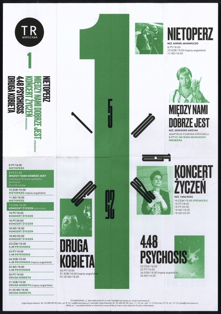 Repertuar Teatru Rozmaitości z sezonu 2014/15 - styczeń Obiekt Repertuar Teatru Rozmaitości z sezonu 2014/15 - styczeń Udostępnij Kategoria: repertuar grafik: Grzegorz Laszuk Ilość stron: 2 Data: 1 stycznia 2015 Język: polski Właściciel dokumentacji: TR Warszawa Licencja: CC 2.0 Warunki udostępniania: Warunki typowe Osoby 0001 Grzegorz Laszuk Grzegorz Laszuk grafik Osoba