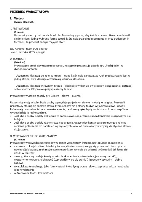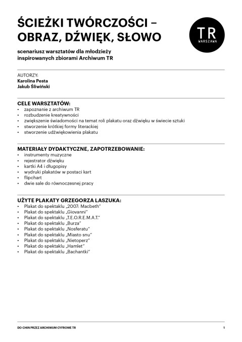 Ścieżki twórczości - obraz, dźwięk, słowo Obiekt item title item title item title item title item title item title Udostępnij Kategoria: programy autor: Karolina Pesta autor: Jakub Śliwiński Ilość stron: 6 Data: 3 listopadaa 2025 Język: polski Właściciel dokumentacji: TR Warszawa Licencja: CC-BY-NC-ND 4.0 Warunki udostępniania: Warunki typowe Spektakle 0001 2007: Macbeth 2007: Macbeth reżyser: Grzegorz Jarzyna autor: William Shakespeare 2005 Spektakl Osoby 0002 Karolina Pesta Karolina Pesta autorka Osoba Jakub Śliwiński Jakub Śliwiński autor Osoba