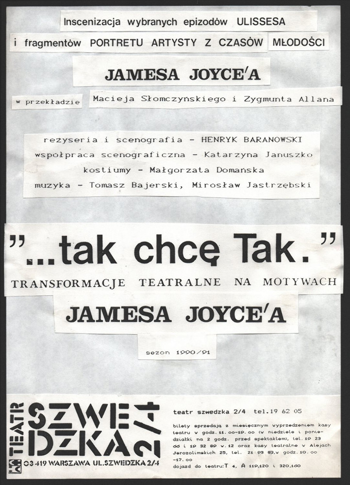 Ulotka z informacją o spektaklu "...tak chcę Tak." Obiekt Ulotka z informacją o spektaklu "...tak chcę Tak." TAGI: spektakl sztuka szwedzka ulisses joyce Udostępnij Kategoria: materiały promocyjne Wymiary obiektu: 210 x 297 mm Ilość stron: 8 Data: 26 stycznia 1991 Język: polski Właściciel dokumentacji: TR Warszawa Licencja: Brak Warunki udostępniania: Sublicencje nieodpłatne Stan zachowania: bardzo dobry Istnienie oryginałów: Archiwum Artystyczne TR Warszawa materiał/technika oryginału: papier nośnik oryginalny: druk na papierze Spektakle 0001 "...tak chcę Tak." "...tak chcę Tak." reżyser: Henryk Baranowski autor: James Joyce 1991 Spektakl